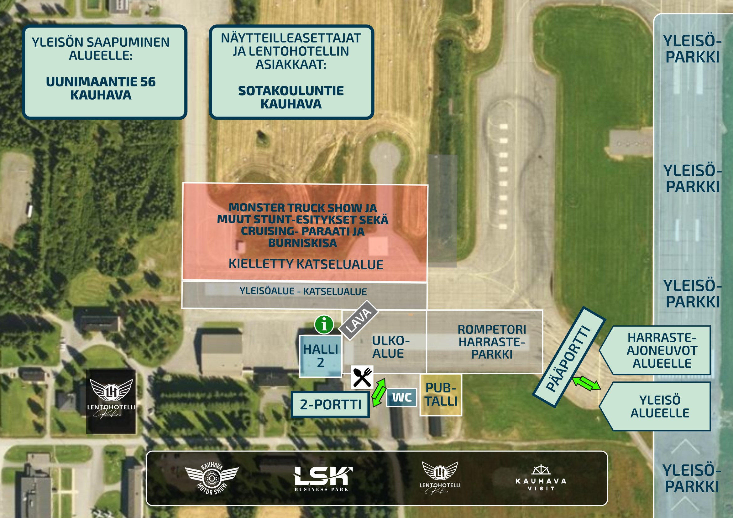 Valtatie 19 ja kantatie 63 kulkevat alueen vierestä ja niiltä on tapahtuma-alueelle opasteet. Yleisöpysäköintiin löydät myös näppäilemällä Navigaattoriin osoitteen Uunimaantie 56, Kauhava.